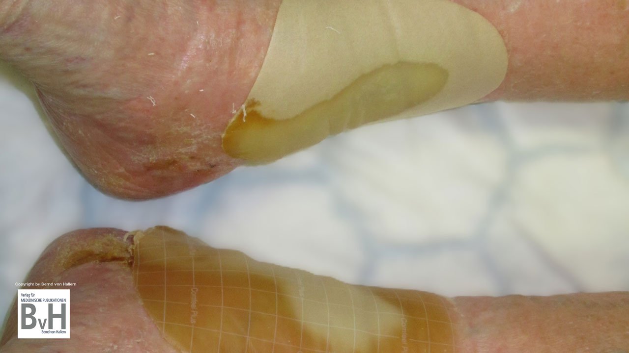 Bild 1: Chronisch venöse Insuffizienz und UCV beider Unterschenkel. Durch die Kompression werden Exsudat und gelöste Hydrokolloidpartikel rasch aus dem Verband herausgedrückt.