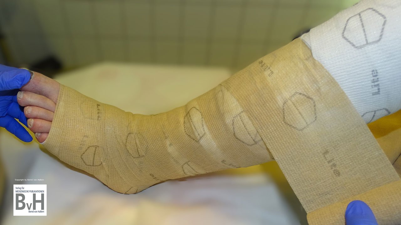 Bild 2: Anlage einer Kompressionsbinde. Bereits bei geringer und mäßiger Exsudation muss bei Hydrokolloid-Verbänden zeitnah ein Verbandwechsel durchgeführt werden.