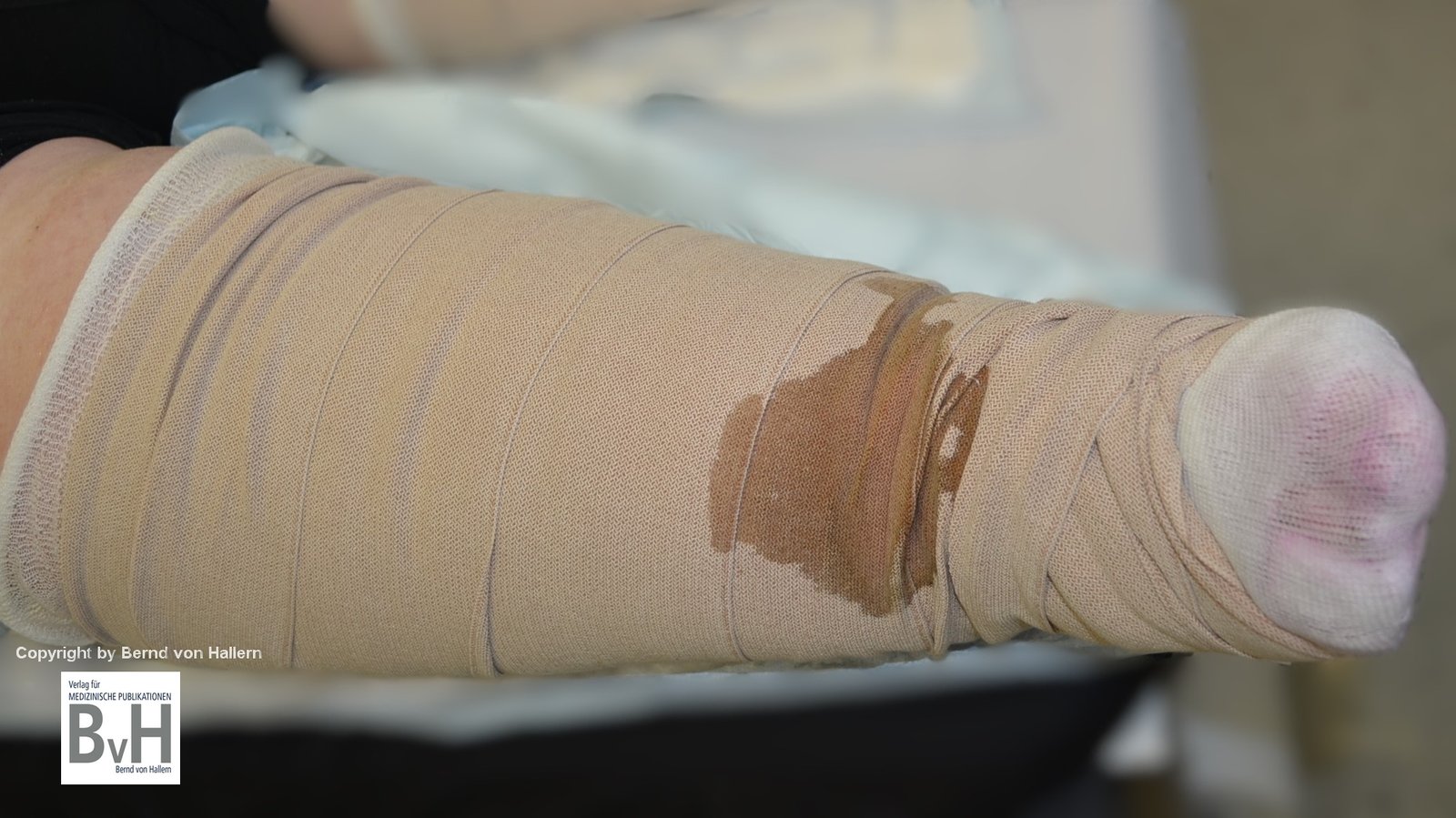 Austretendes Exsudat verunreinigt Kompressionsbinde und Wäsche