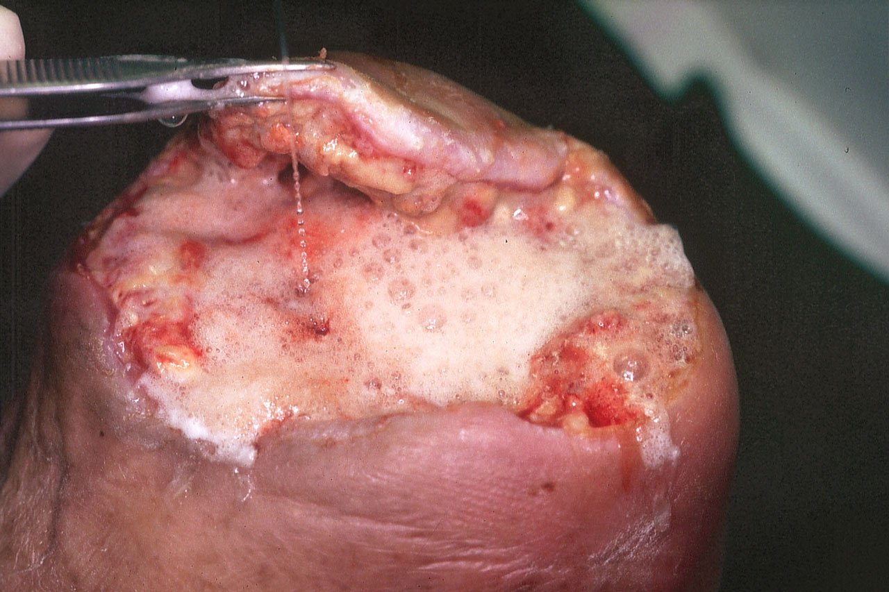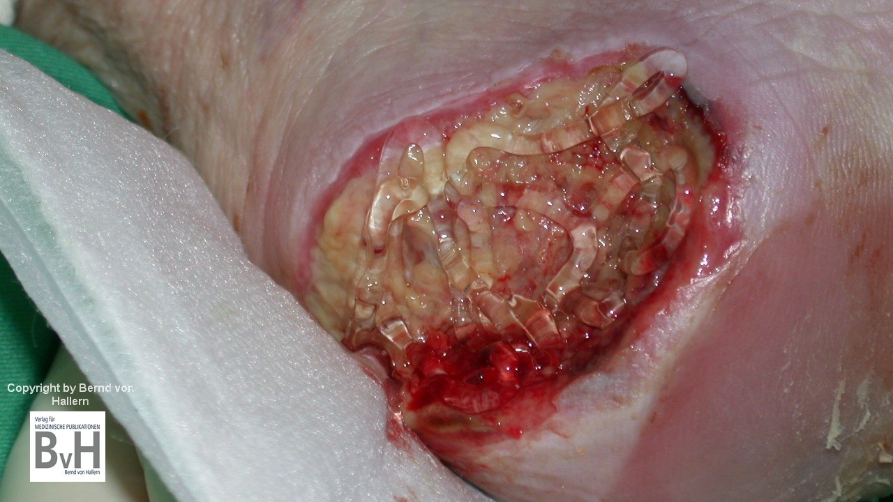 Bild 1: Abgestorbene Maden bei Pseudomonas Infektion postoperativ am Vorfuß.