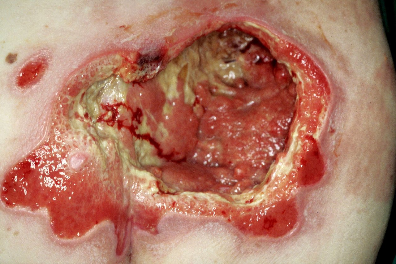 Bild 2: Granulierender sakraler Dekubitus, keine Infektion, vor Spülung mit H2O2.