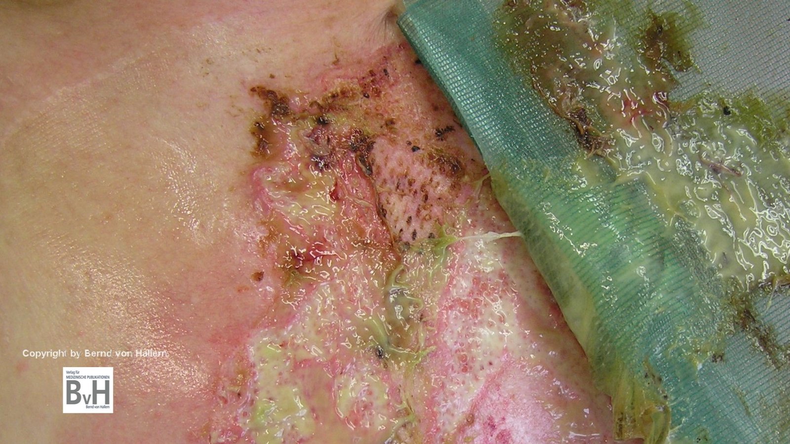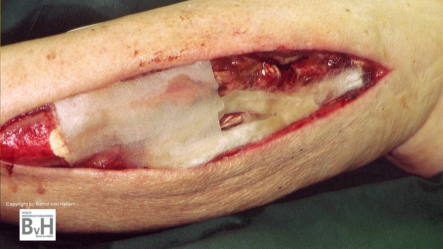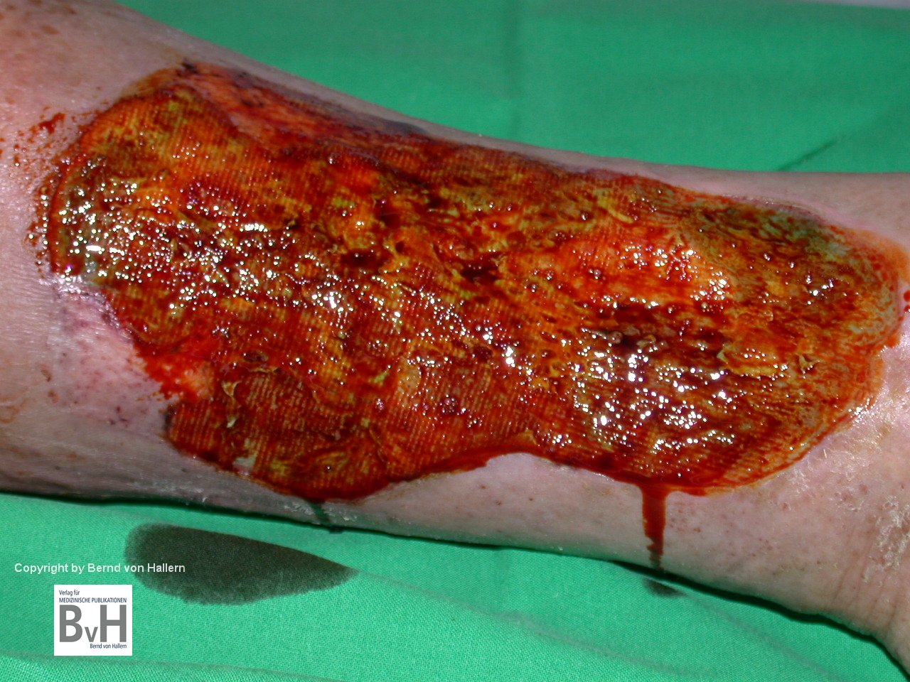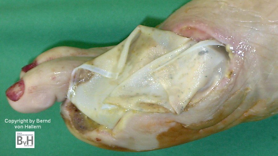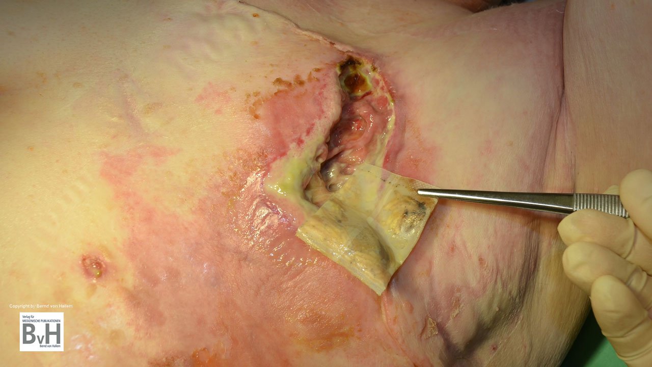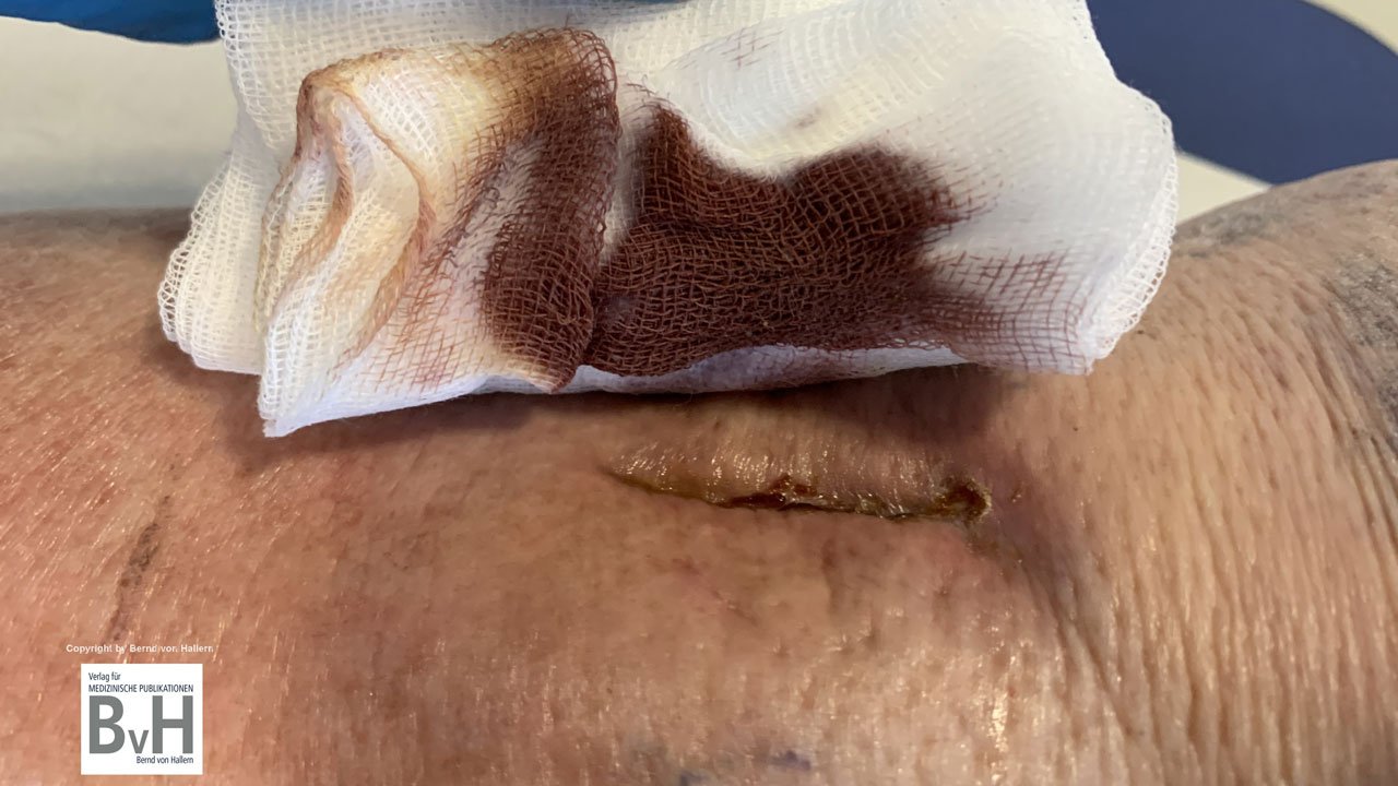 Bild 2: Zustand nach Teilentfernung eines nekrotischen Hautransplantates , es blutet…