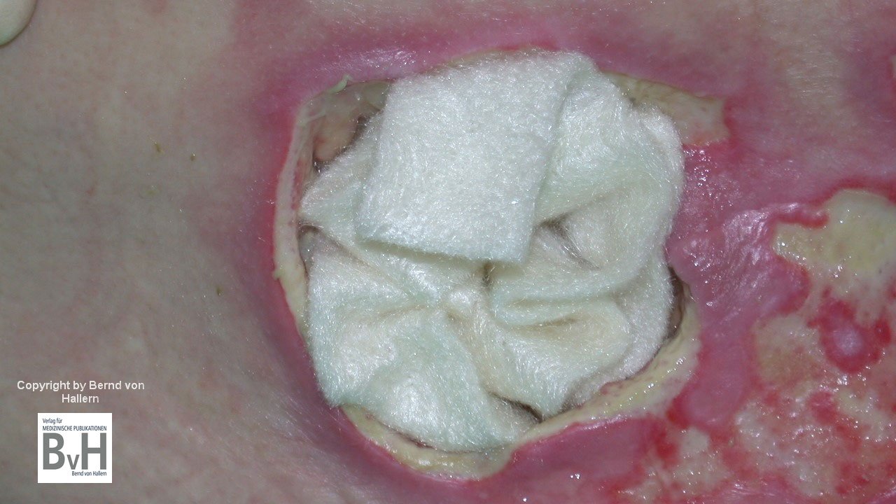 Persönliche Anmerkung: Wir haben heute ausreichend viele gute Möglichkeiten einer lokalen Antiseptik durch Verbandstoffe. Die gezeigten Bilder mögen einmalig bleiben.