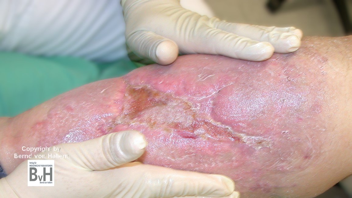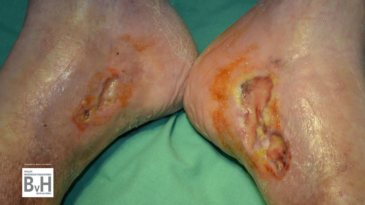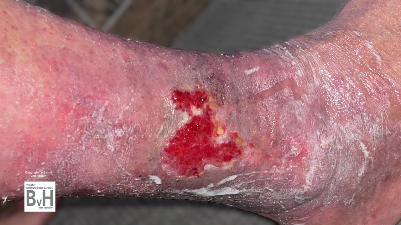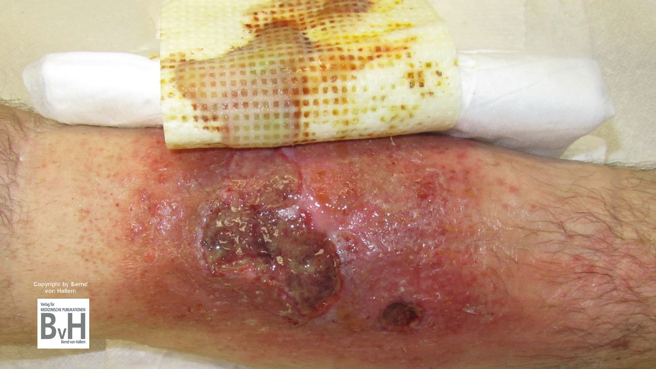 Bild 3: Kritisch kolonisierte Ulzera an beiden Unterschenkel sollen antiseptisch therapiert werden. NICHT NACHAHMEN