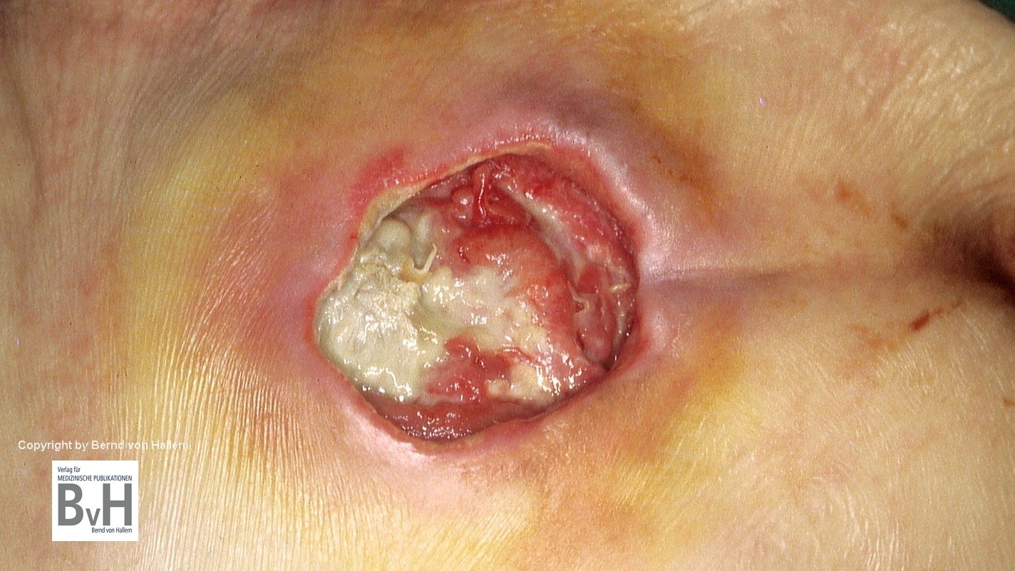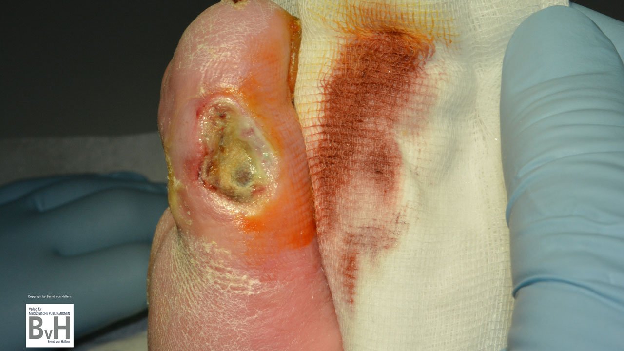 Bild 1: Ulkus an der Großzehe bei DFS. Erstversorgung mit PVP-Iod-Salbe. Die Wunddesinfektion mit Octenisept® führt zur Iod-Freisetzung