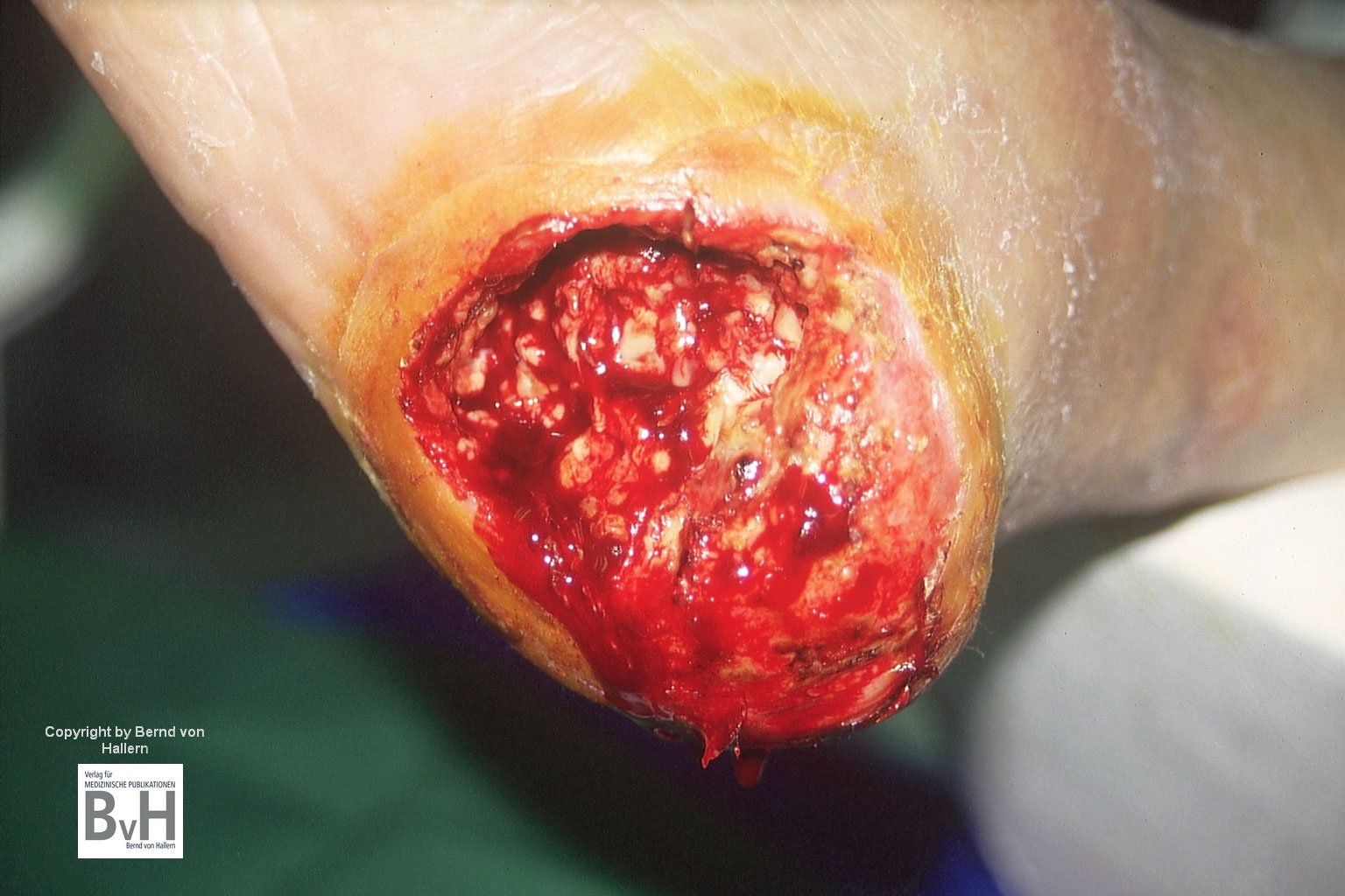 Bild 1: Zustand nach Nekrektomie einer Fersennekrose, die Wunde blutet…