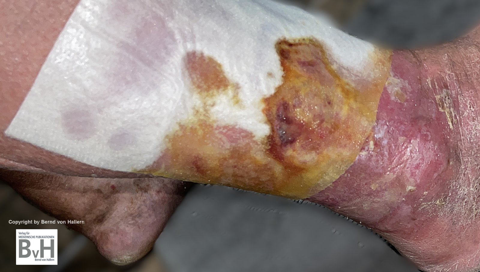 Bild 2: Ein semiokklusiver Verband auf einer infizierten Wunde ist grundsätzlich kontraindiziert, auch wenn eine antiseptisch wirkende Salbe zusätzlich eingesetzt wird.