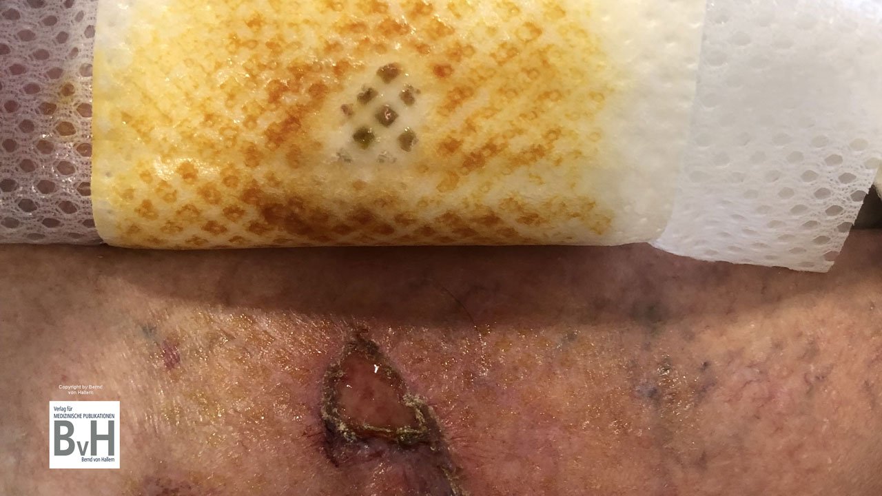 Bild 1: Eine Kombination aus PVP-Iod und NOSF-Wundverband ist keine Lösung bei einer lokal infizierten Wunde. Dies auch, weil die NOSF-Matrix an Wirkung verliert.